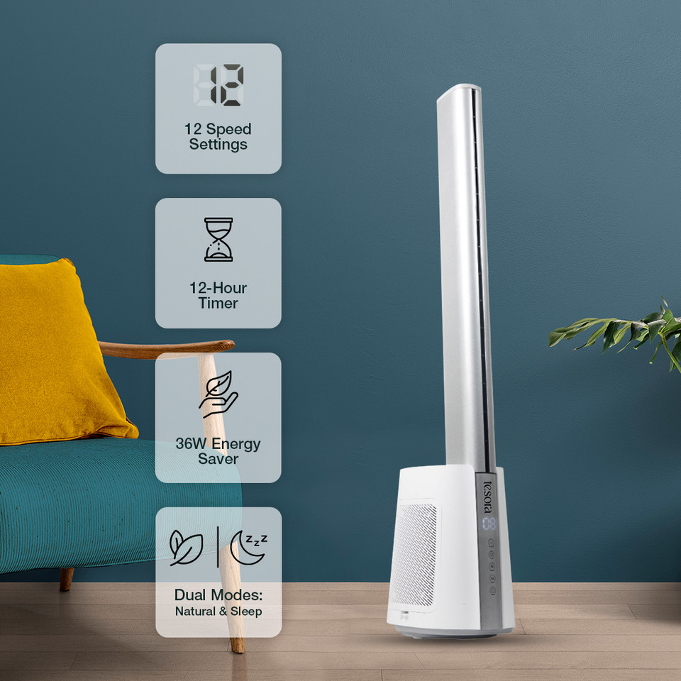 - CUSTOMIZABLE AIRFLOW FAN DESIGN: Tesora Bladeless Tower Fan is powered by 12 Wind Speeds & 2 Modes, perfectly customised to meet your desired Air Circulation needs.